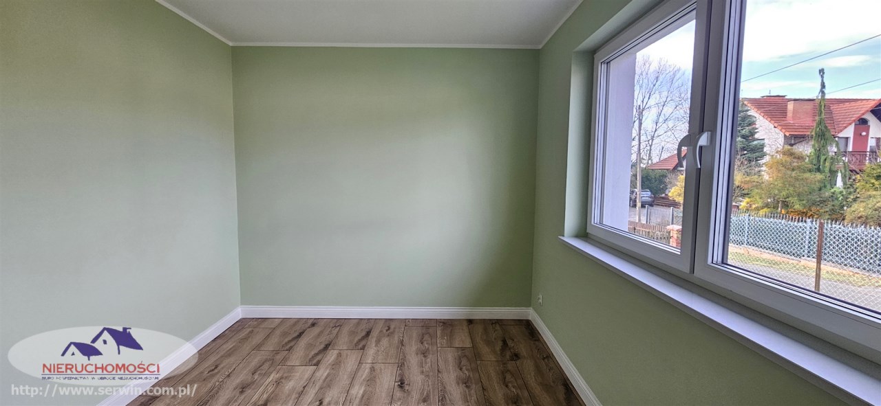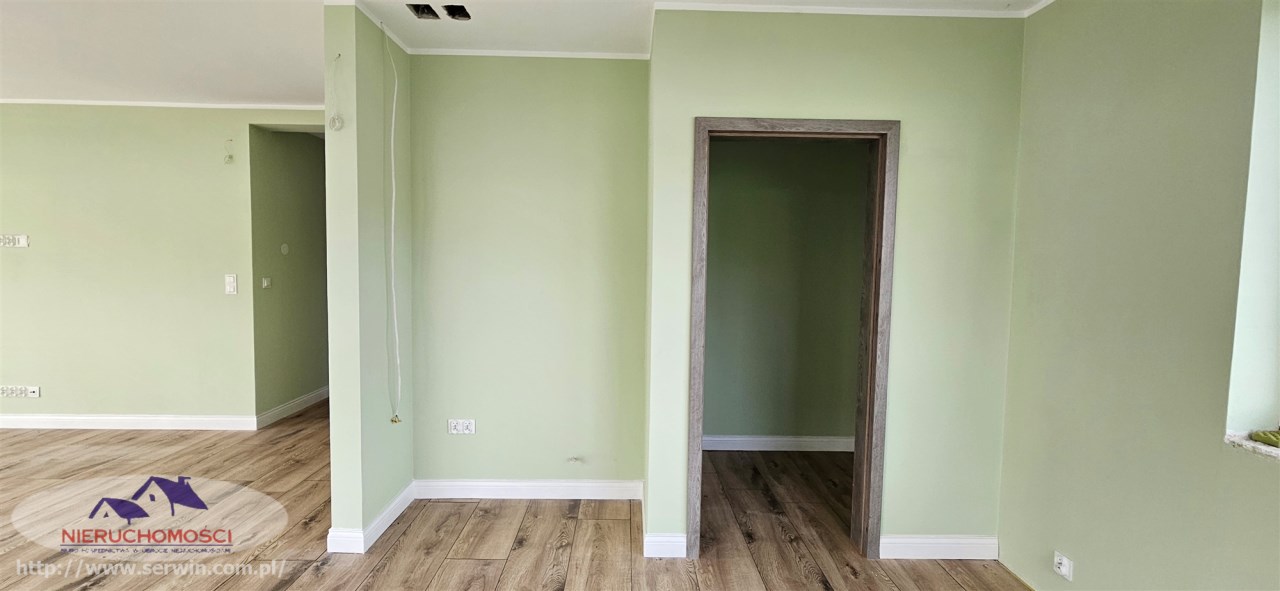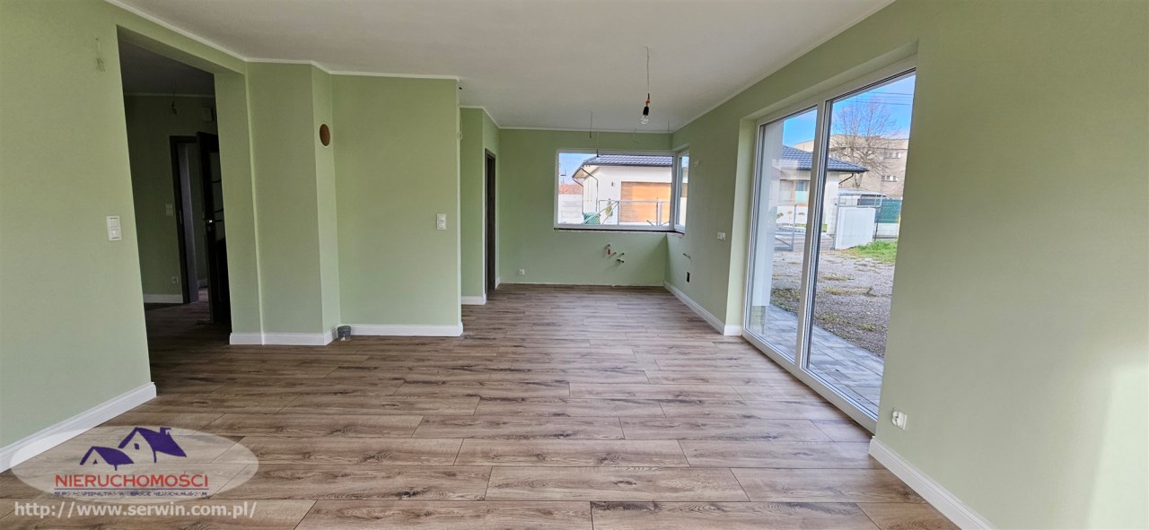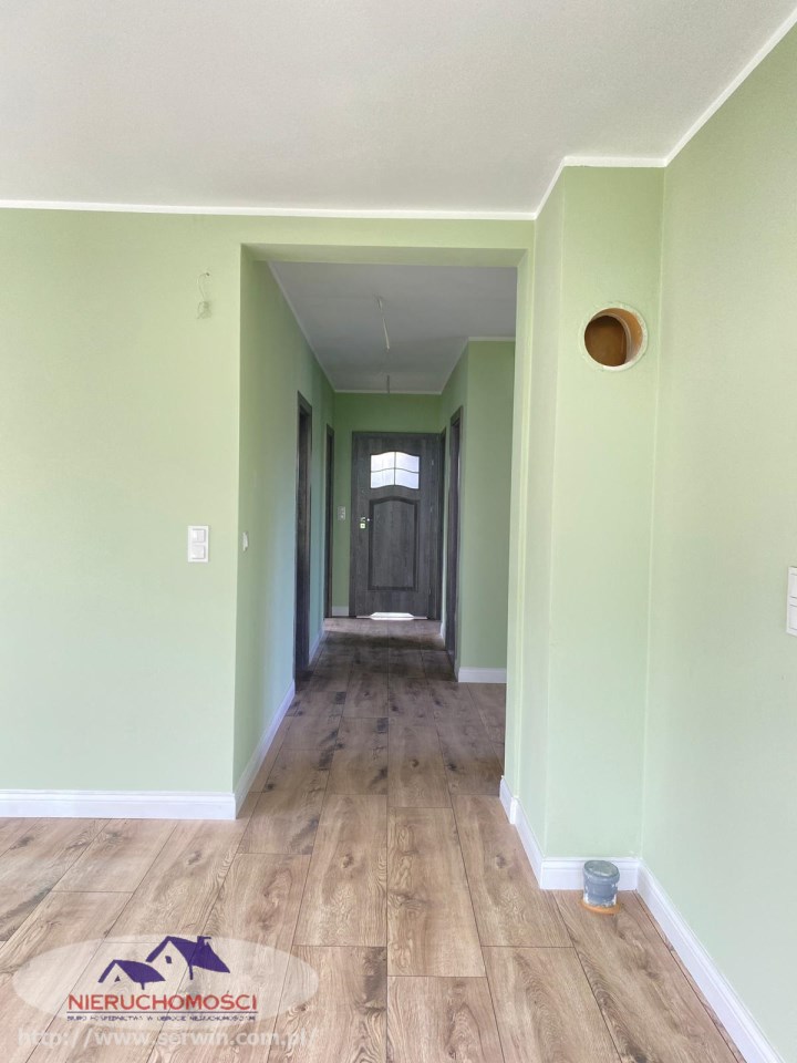 Stan do zamieszkania – wnętrze wykończone: na podłogach nowoczesne panele i płytki oraz stolarka wewnętrzna.