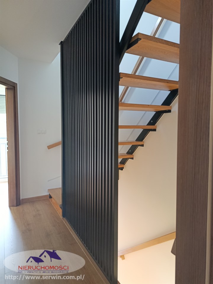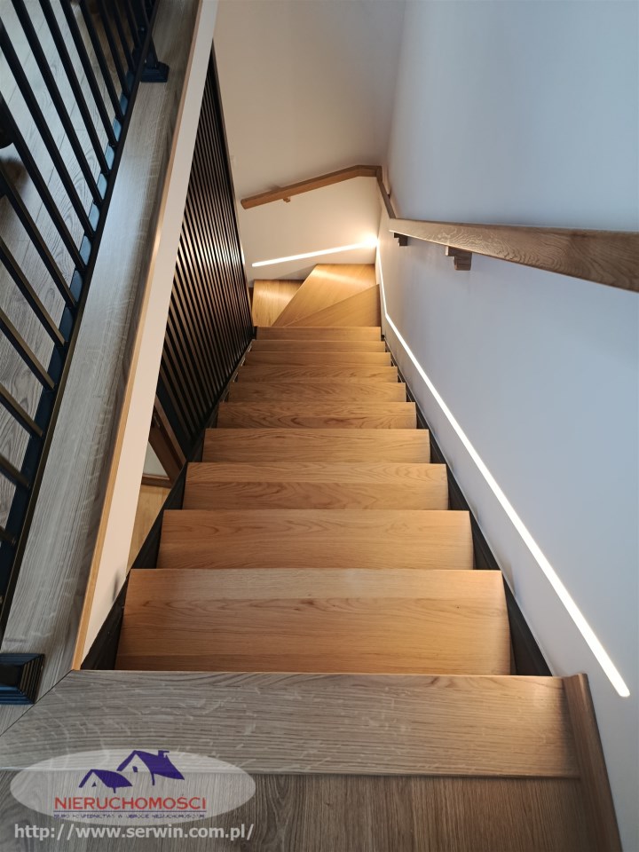 Na podłogach panele wysokiej klasy, płytki oraz schody drewniane,
